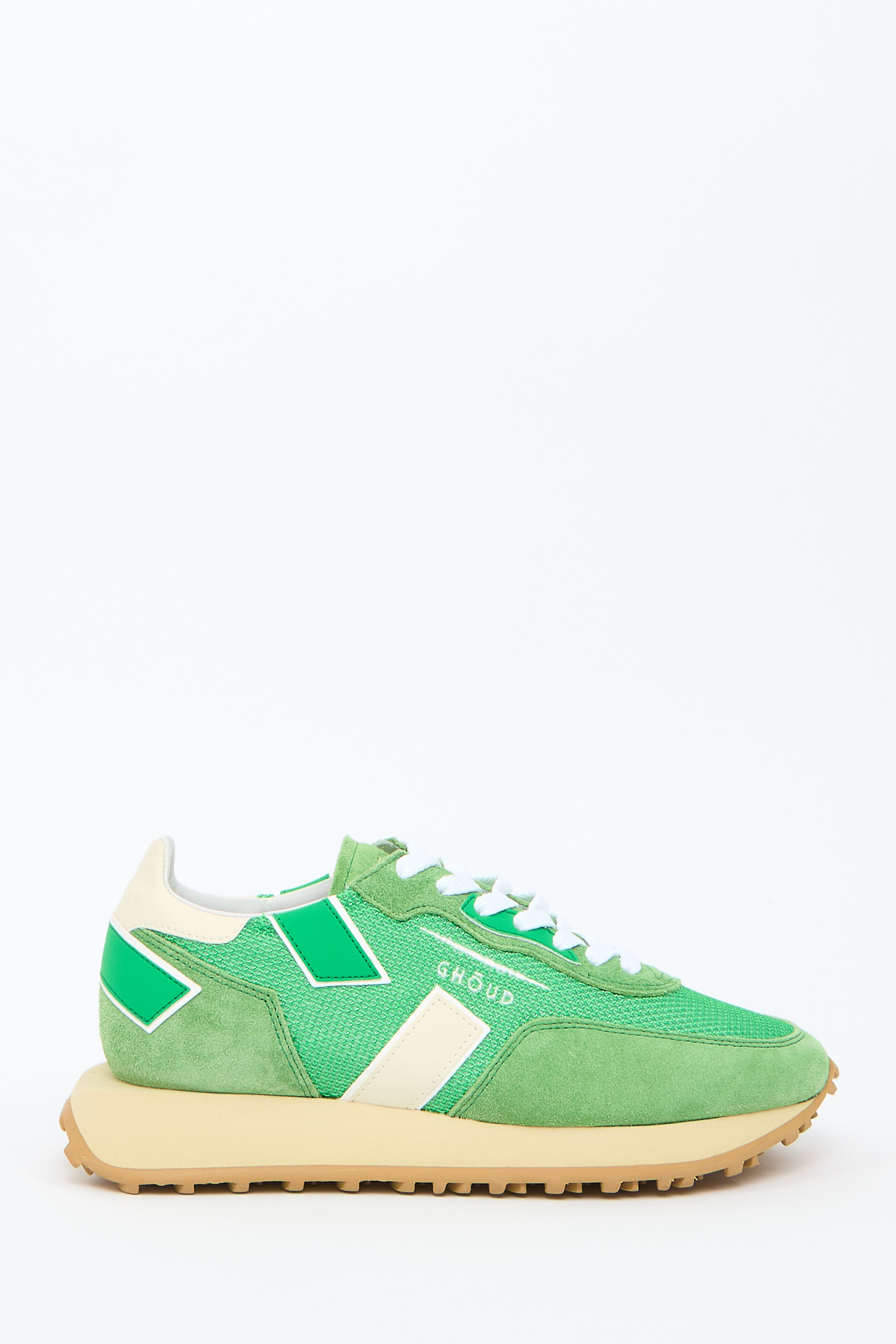 Вышитый логотип сбоку, тисненый логотип сзади, тисненый логотип на язычке, вставки, закругленный носок, шнуровка спереди, стелька с логотипом и плоская резиновая подошва.
