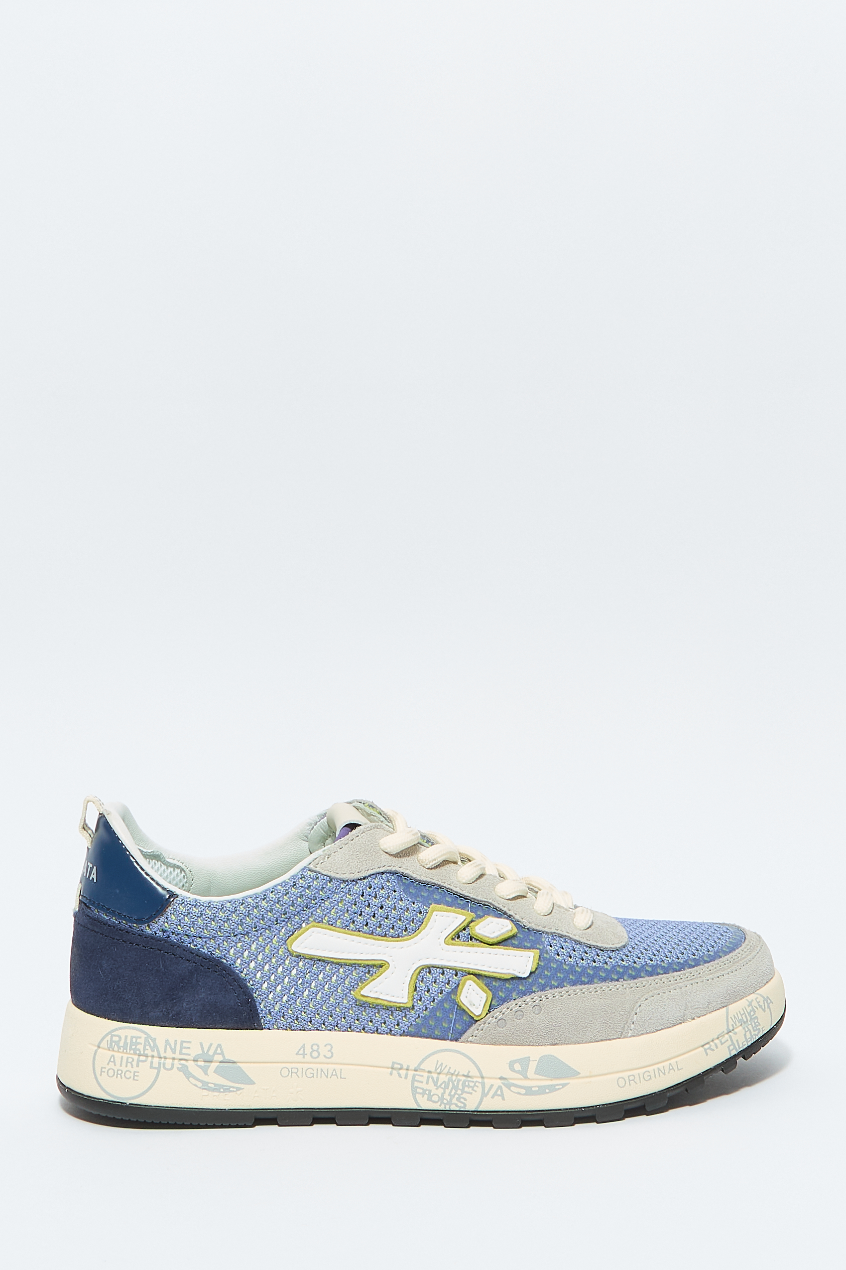 Замша из телячьей кожи, сетка, закругленный носок, аппликация с логотипом сбоку, нашивка с логотипом на язычке, логотип на пятке, петля для подтягивания сзади, тисненая деталь, кожаная стелька с логотипом, плоская резиновая подошва, шнуровка спереди.
