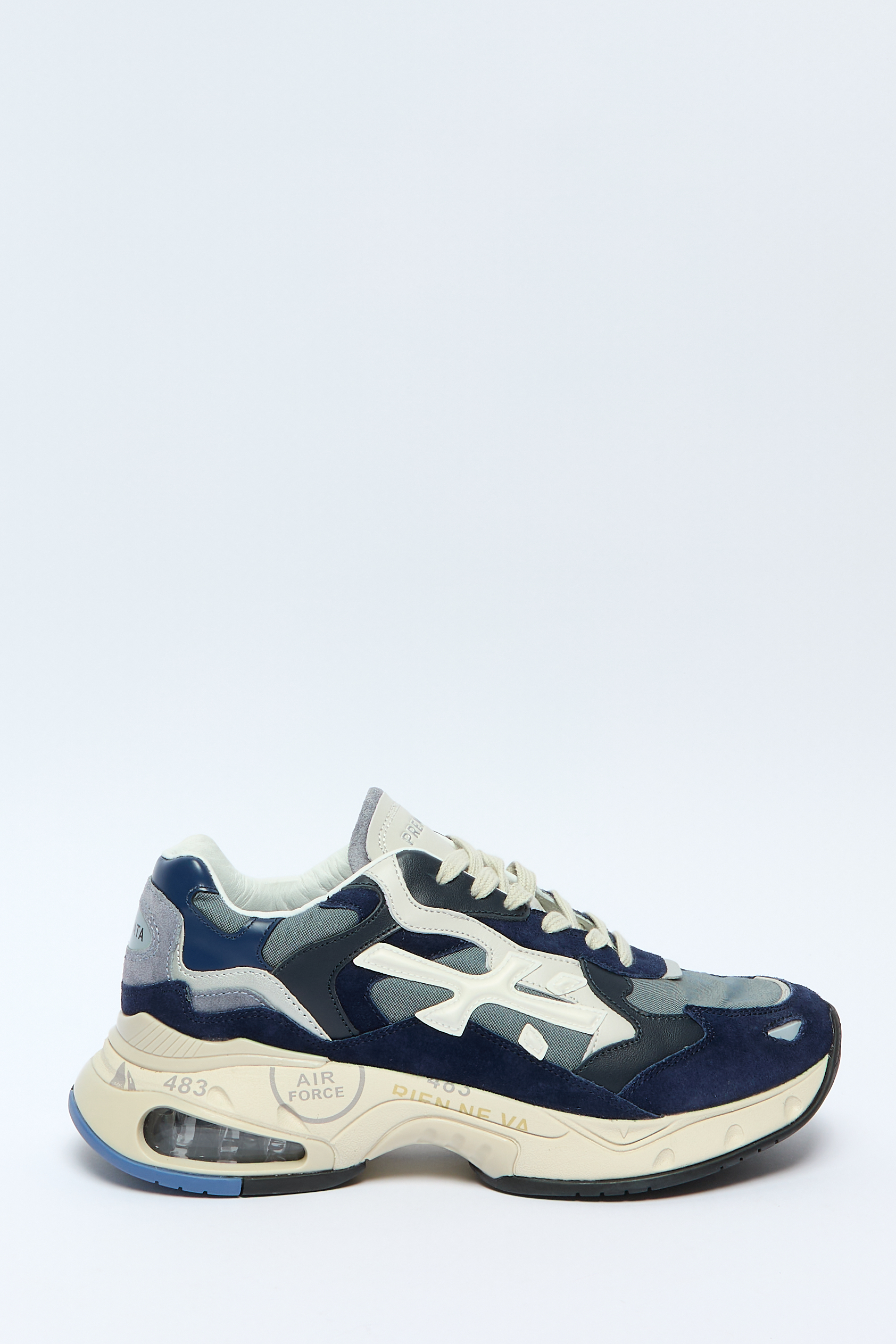 Дизайн со вставками, миндалевидный носок, замшевые вставки, вставки из сетчатой ткани, аппликация с логотипом сбоку, язычок с логотипом, логотип на пятке, тисненая деталь, кожаная стелька с логотипом, массивная полупрозрачная подошва из резины.