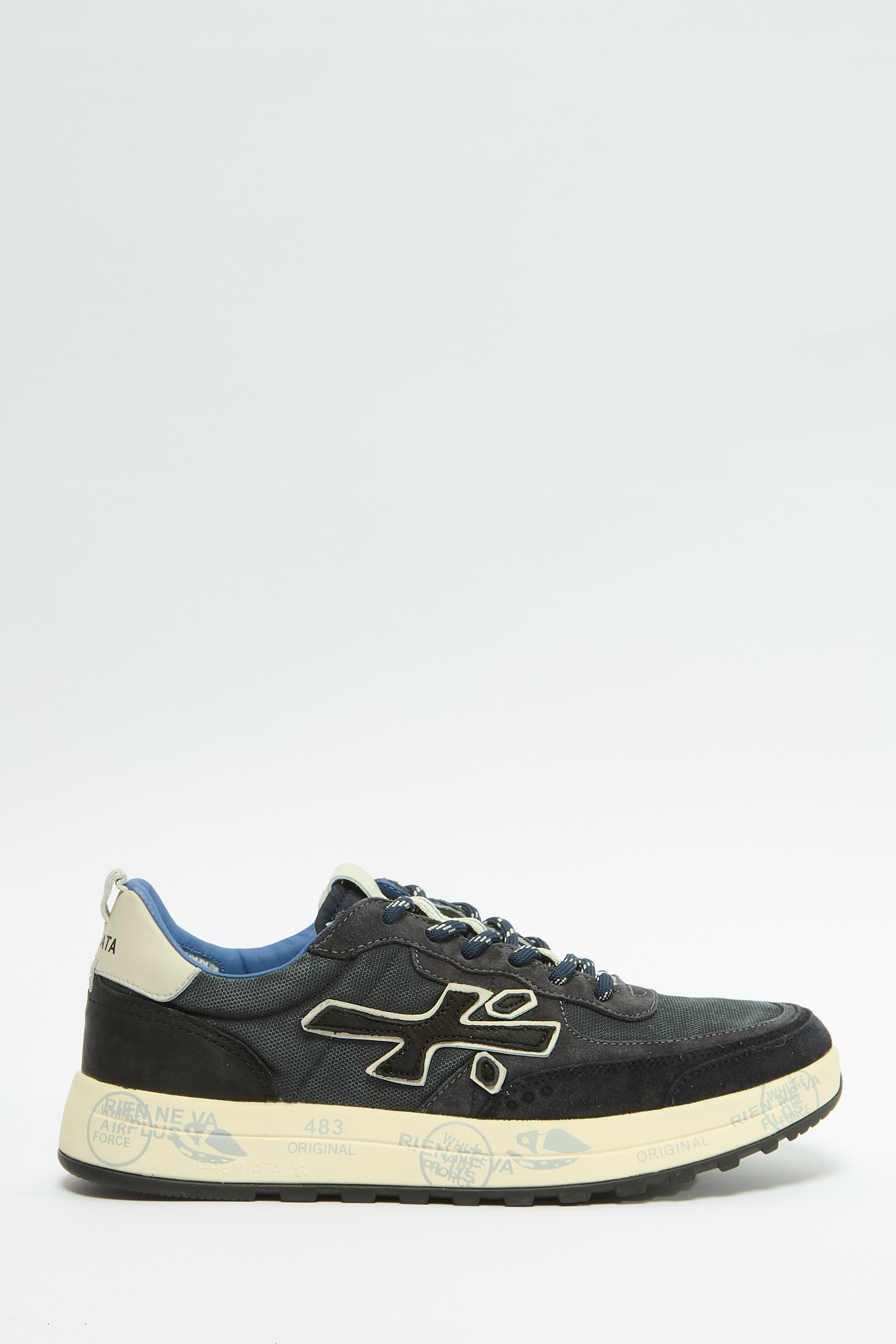 Мужские кроссовки Premiata.Кроссовки из натуральной замши и текстиля в чёрно-серой гамме с контрастной белой подошвой и яркими деталями. Фирменная массивная подошва с графичным принтом обеспечивает комфорт и амортизацию при ходьбе. Классическая шнуровка с акцентными шнурками и крупный логотип бренда подчеркивают современный и премиальный стиль модели.