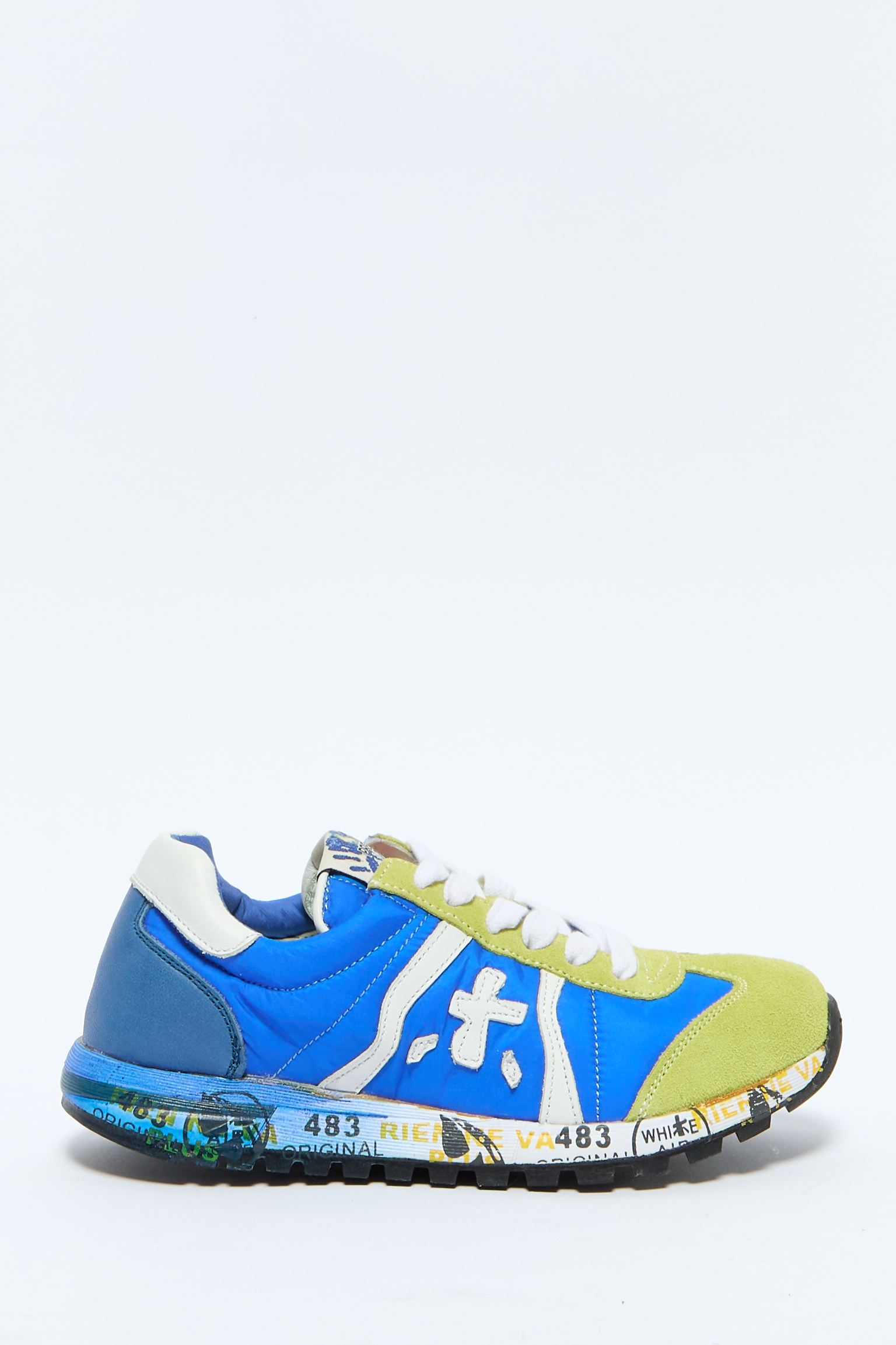 Нашивка с логотипом сбоку, логотип сбоку, нашивка с логотипом на язычке, тисненый логотип сзади, логотип на подошве, закругленный носок, шнуровка спереди, кожаная стелька с логотипом, резиновая подошва, сочетание двух ярких цветов.