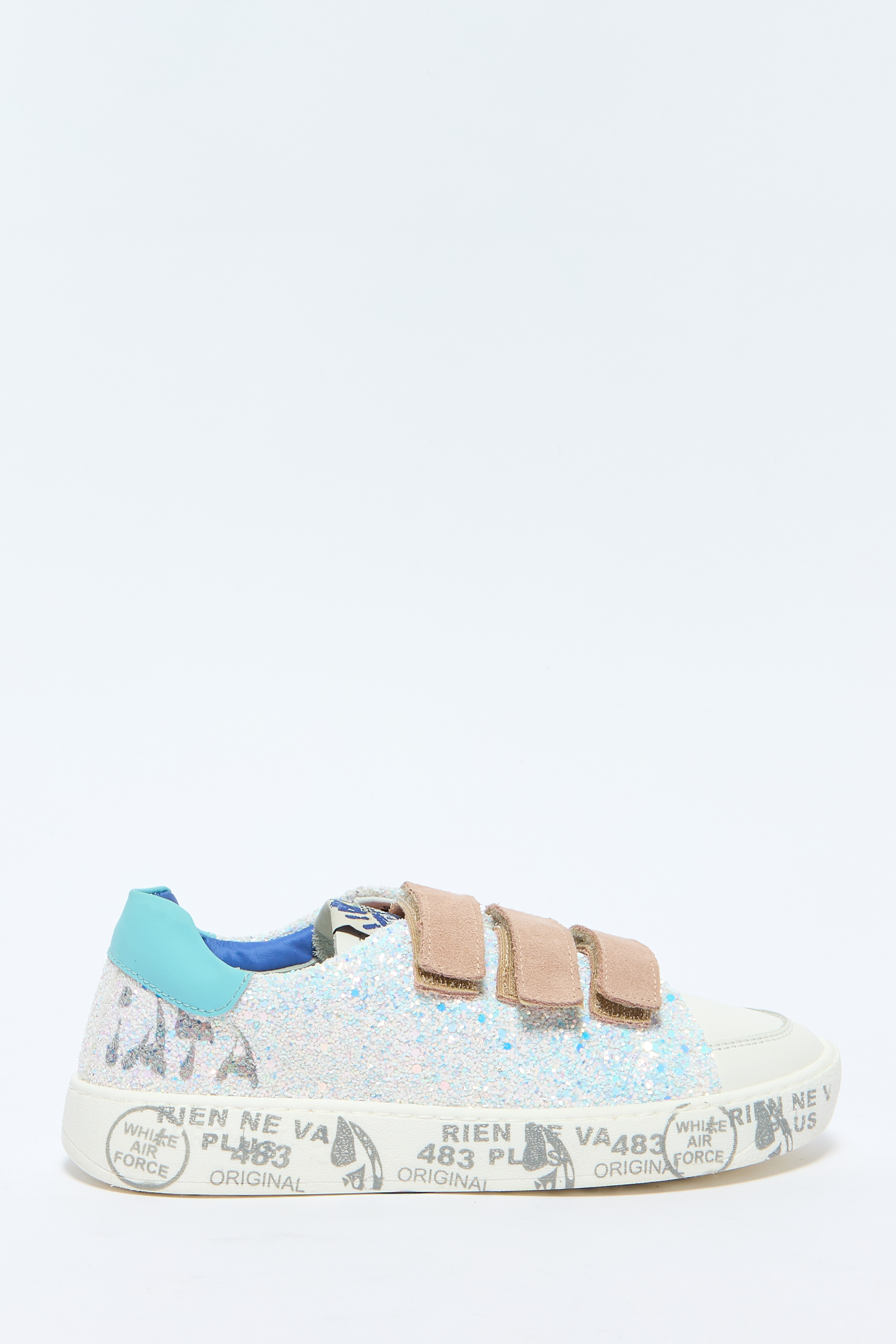 Кеды из гладкой кожи, блестящий принт, круглый мыс, застежка на липучках спереди, контрастный задник, плоская подошва.