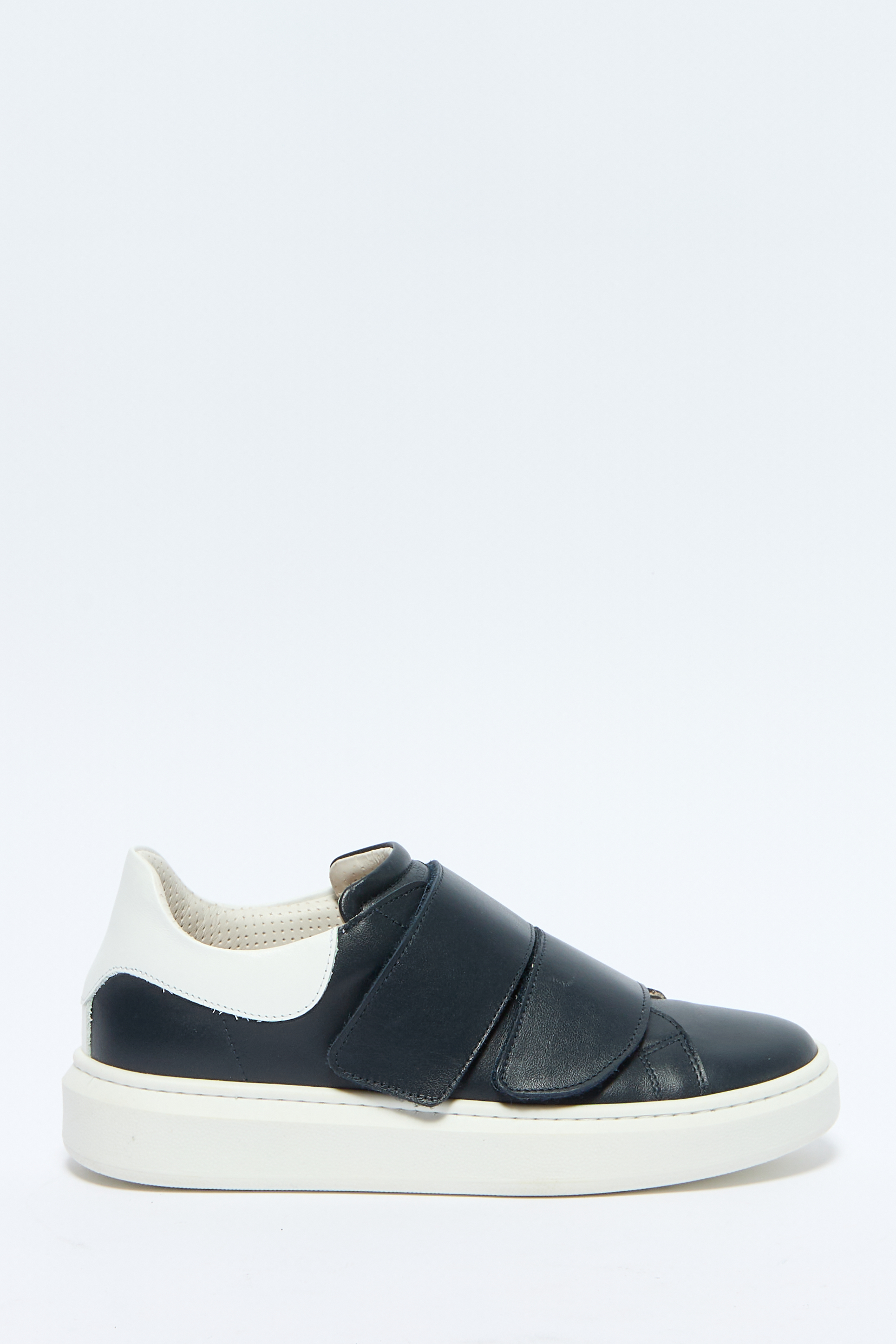 Плоская резиновая подошва, контрастный задник и застежка на липучках спереди.