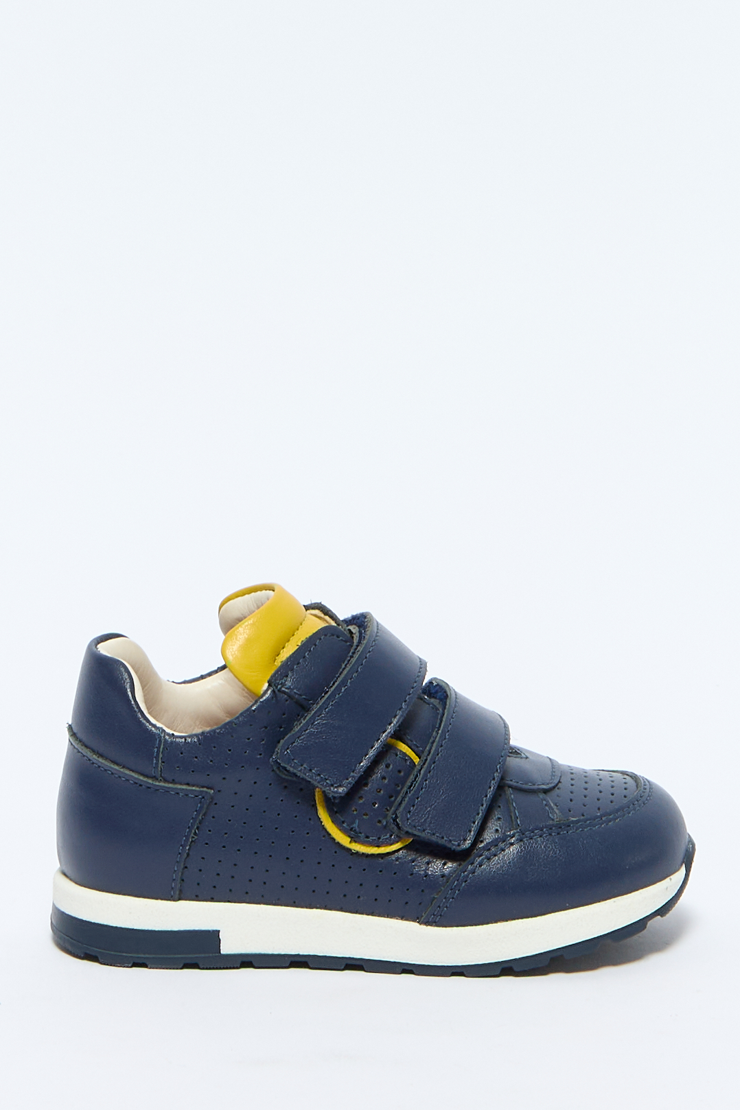 Кеды из гладкой кожи, круглый мыс, застежка на липучках спереди, плоская подошва и перфорация на носке.