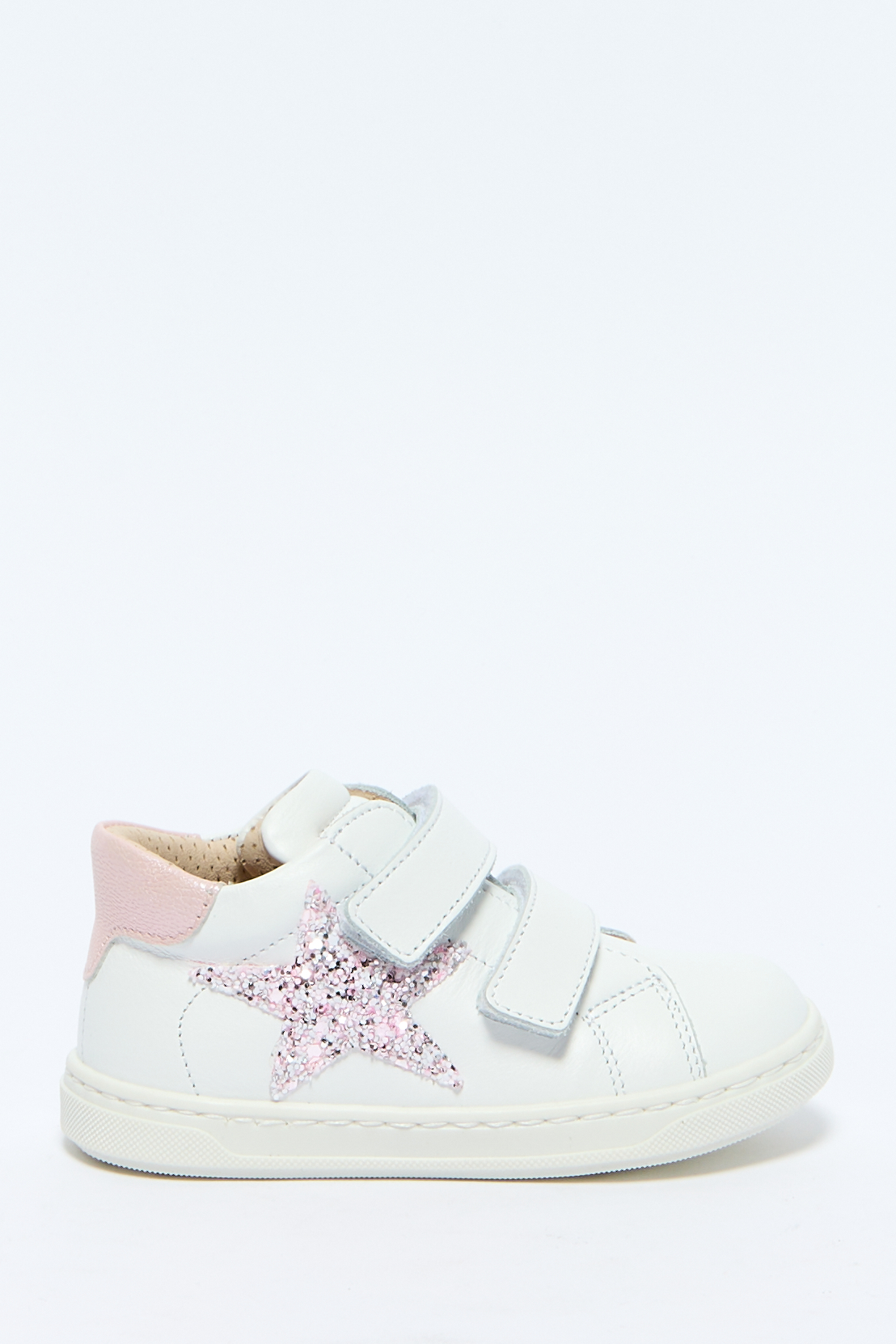Кеды из гладкой кожи, блестящий принт сбоку, круглый мыс, застежка на липучках спереди, контрастный задник, плоская подошва.