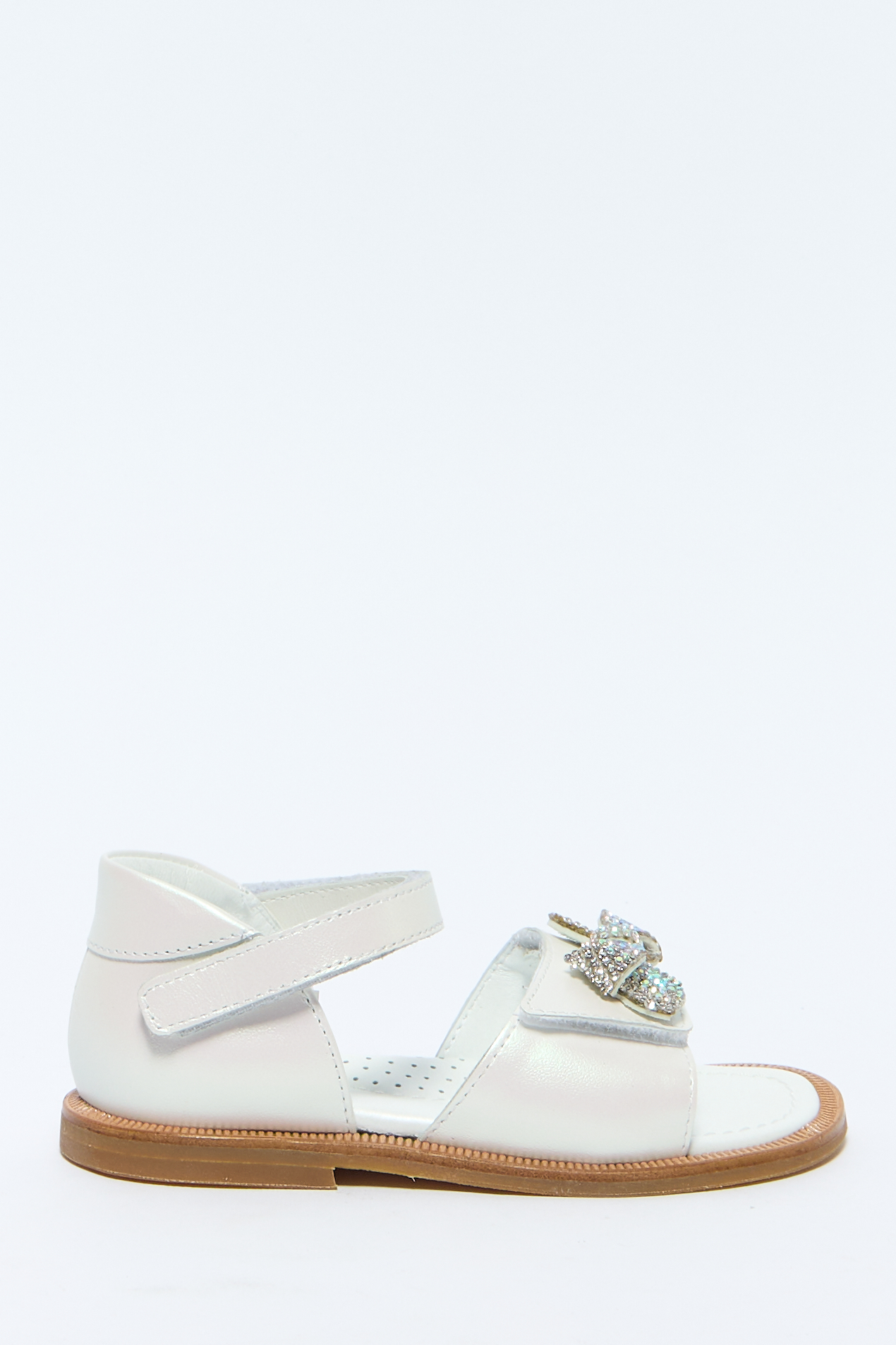 Перламутровый окрас, застежка на липучках спереди, декоративный металлический бант с кристаллами спереди, открытый носок и плоская подошва.