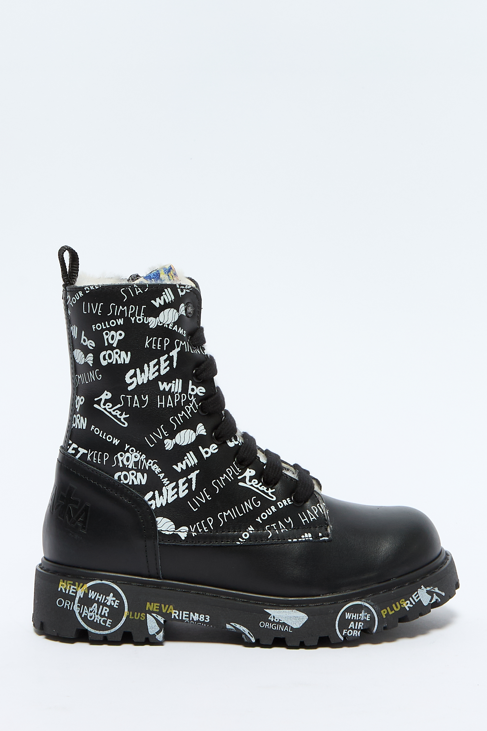 Дизайн с принтом, застежка на молнии сбоку и шнуровка спереди, массивная ребристая подошва, круглый носок и вставки из меха овцы.