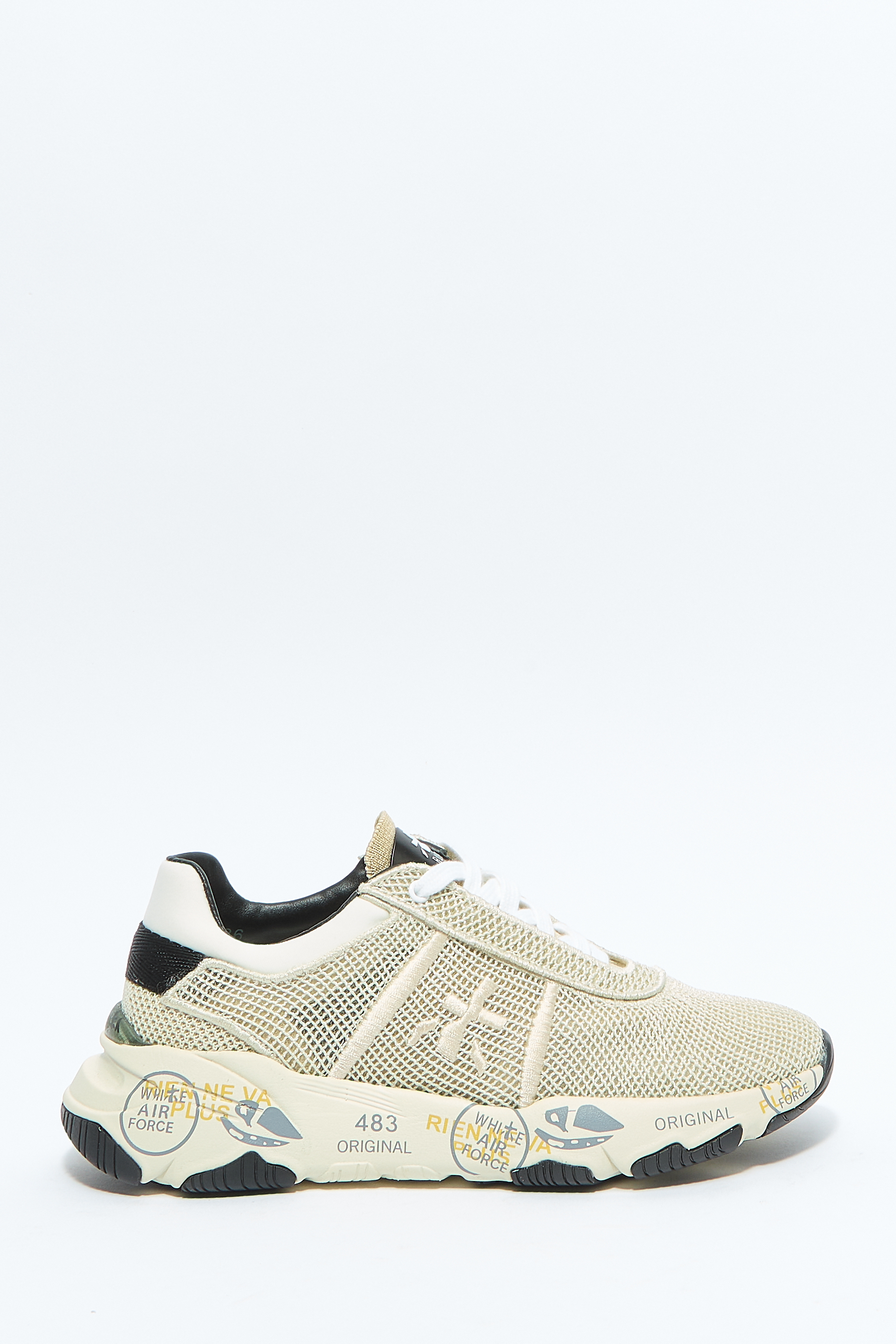 Сетка, вышитый логотип сбоку, нашивка с логотипом на язычке, закругленный носок, шнуровка спереди, стелька с логотипом и плоская резиновая подошва.