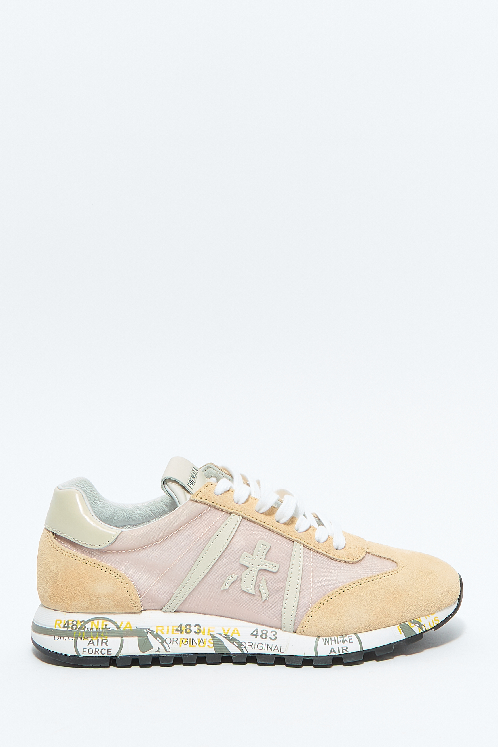 Нашивка с логотипом сбоку, нашивка с логотипом на язычке, вставки, шнуровка спереди, закругленный носок, плоская резиновая подошва и стелька с логотипом.