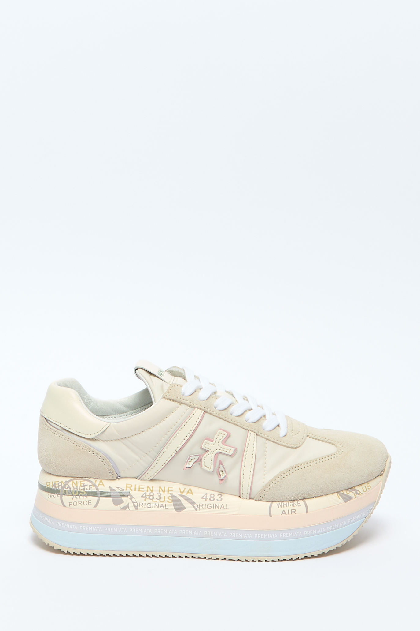 Дизайн со вставками, замшевые вставки, нашивка с логотипом сбоку и на язычке, контрастный задник, графичный и текстовый принт на подошве, полоска с логотипом, закругленный носок, шнуровка спереди, уплотненная щиколотка, кожаная подкладка, кожаная стелька с логотипом, массивная резиновая подошва на платформе.