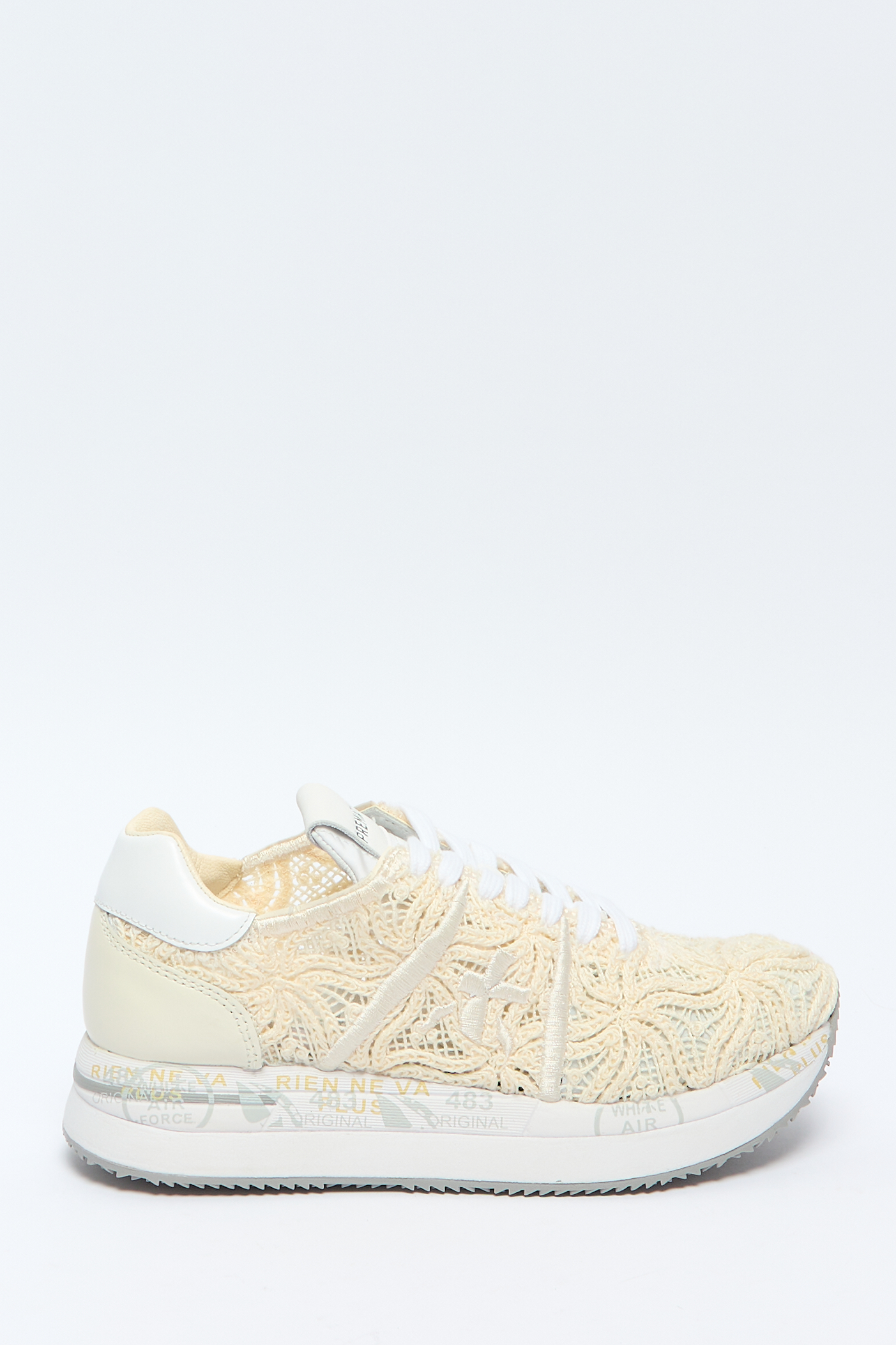 Вязаный дизайн, ажурная вязка, кожаные вставки, вышитый логотип сбоку, нашивка с логотипом на язычке, графичный и текстовый принт на подошве, закругленный носок, шнуровка спереди, модель без подкладки, кожаная стелька с логотипом, массивная резиновая подошва .