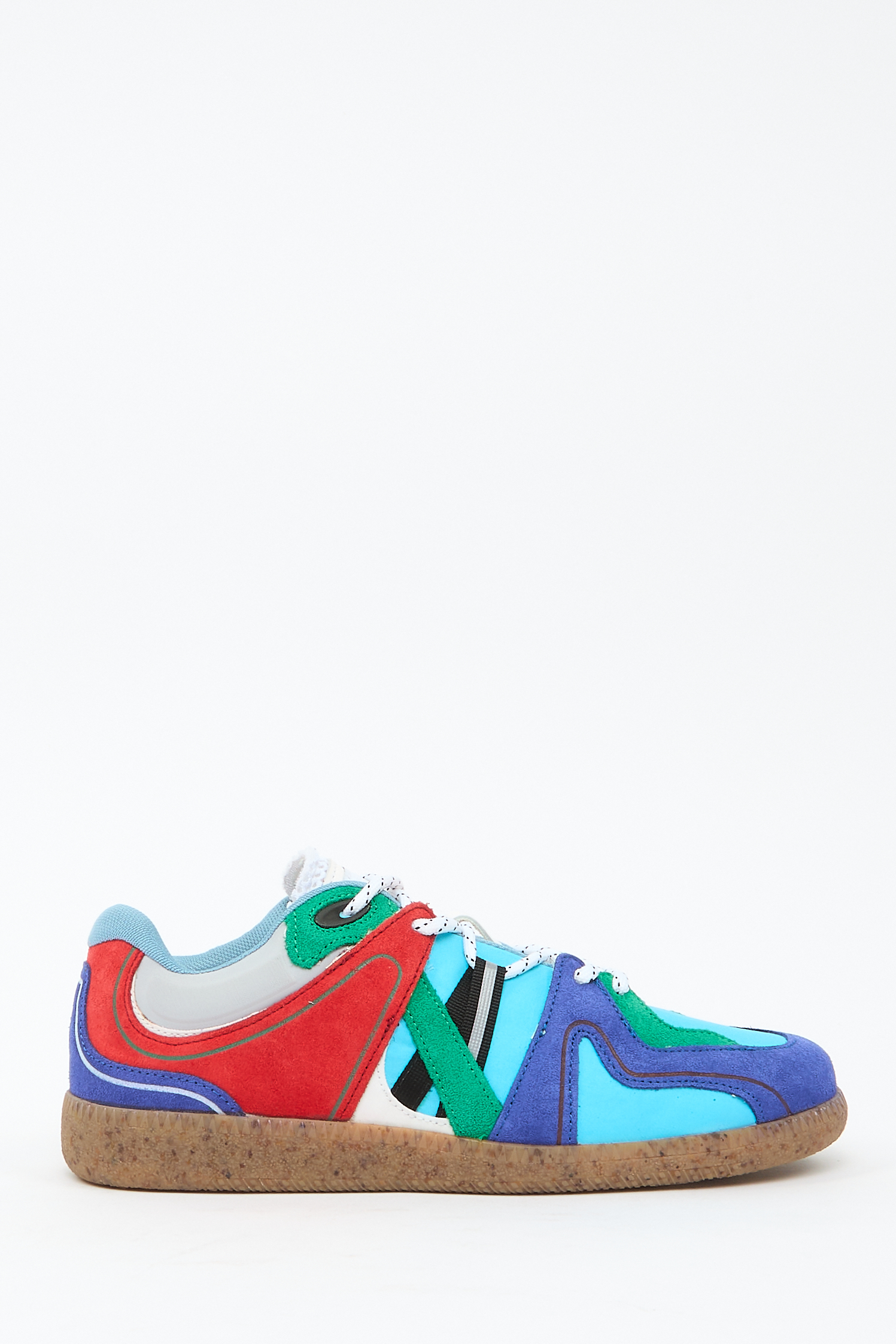 Нашивка с логотипом на язычке, тисненый логотип сбоку, закругленный носок, шнуровка спереди, стелька с логотипом, плоская резиновая подошва, контрастные вставки.
