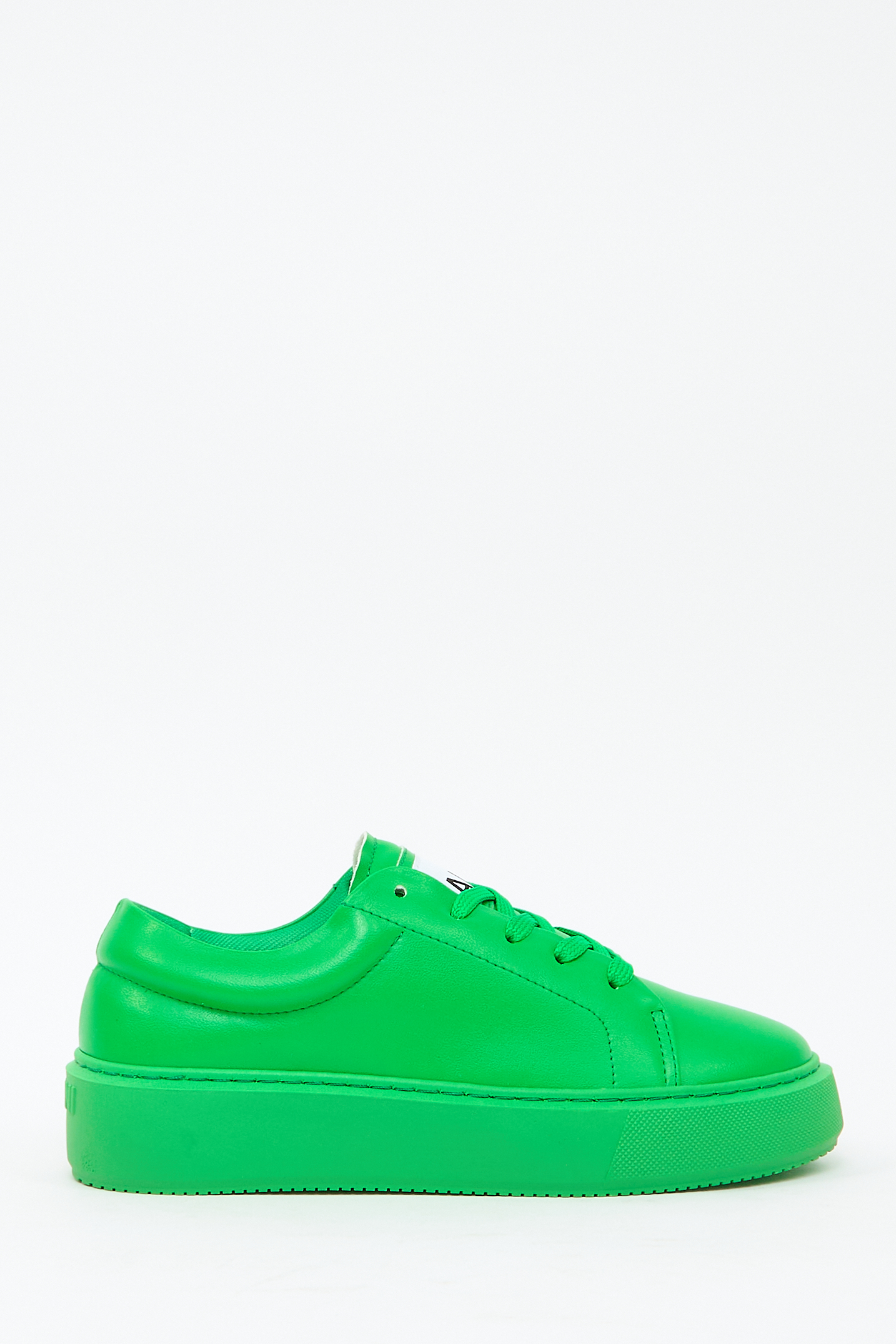 Тисненый логотип спереди, нашивка с логотипом на язычке, закругленный носок, перфорированный носок, шнуровка спереди и плоская платформа.