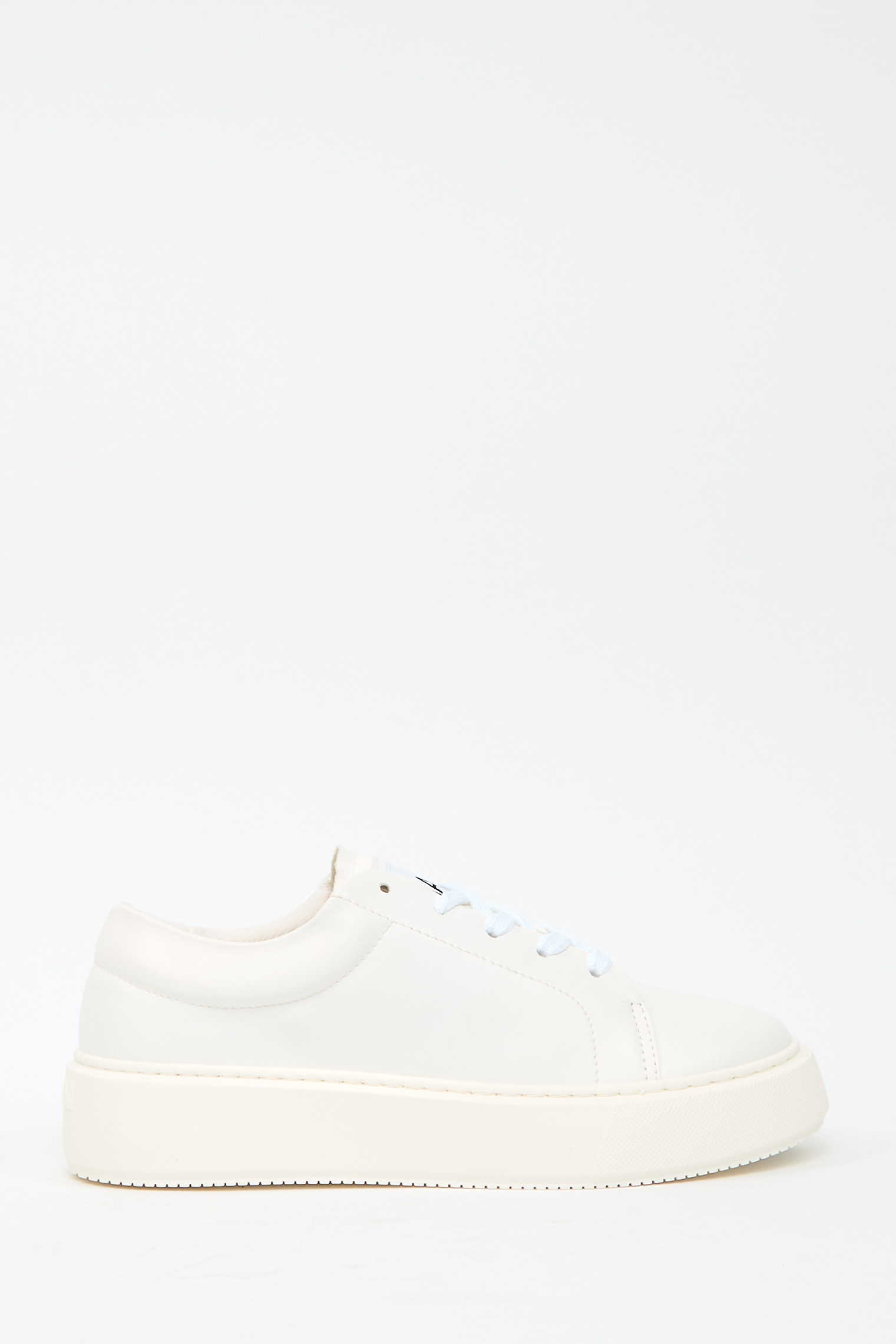 Тисненый логотип спереди, нашивка с логотипом на язычке, закругленный носок, перфорированный носок, шнуровка спереди и плоская платформа.