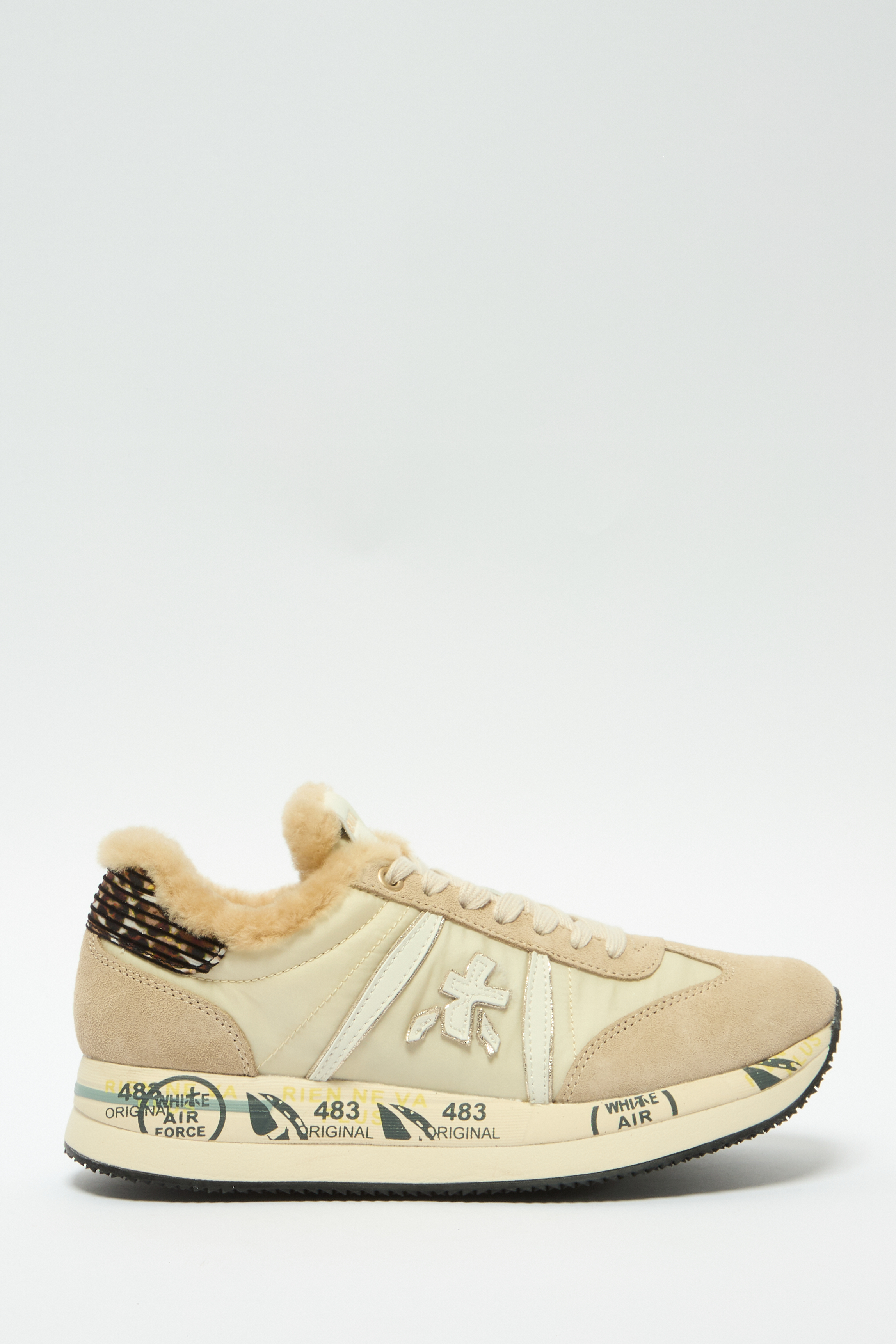 Кроссовки Conny с внутренней отделкой из пушистой овчины выполнили из текстиля, гладкой кожи и замши.Модель на широкой легкой подошве с фирменными штампами декорировали логотипом на язычке и эмблемами-иероглифами по бокам.