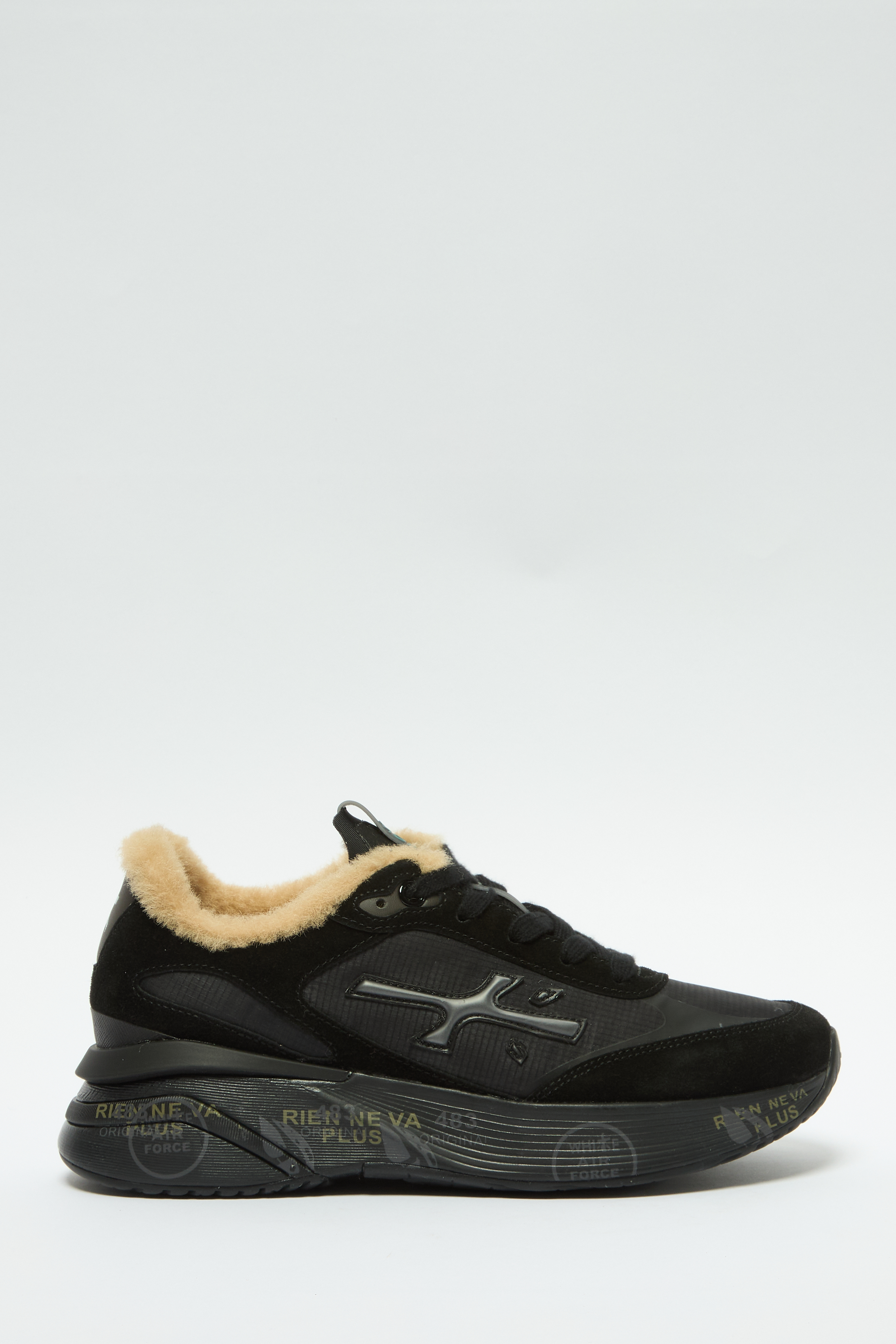Черные кроссовки с логотипом, низким голенищем, шнуровкой, шерстяной подкладкой и замшевым верхом.