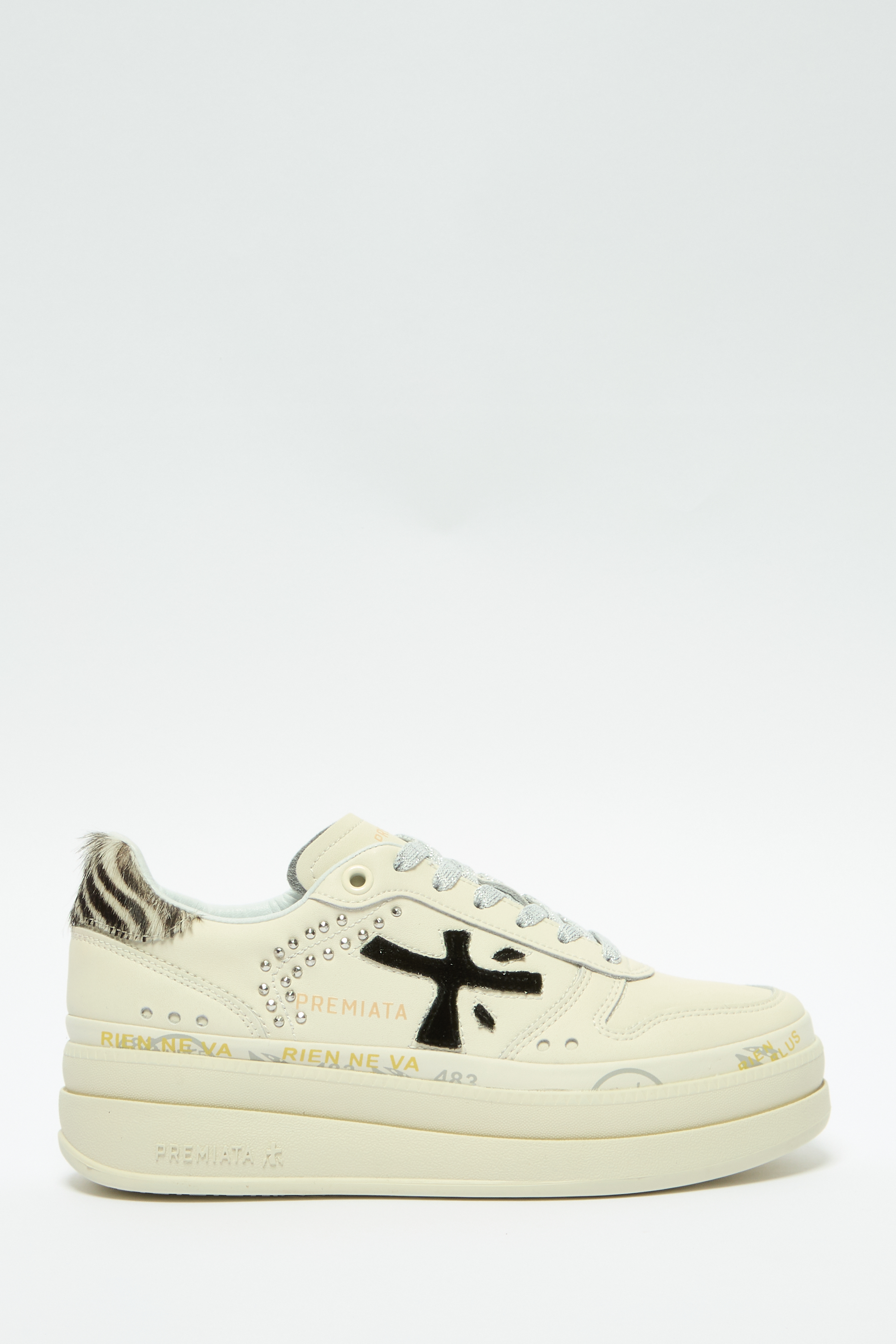 Утрированно широкая подошва белых кедов Micol добавит несколько сантиметров к росту и сгладит неровности на дороге. Модель с фирменными печатями и штампами на плоском ранте и логотипом по бокам и на заднике сшили из легкого прочного текстиля.Для прочности пару дополнили фигурными кожаными накладками.