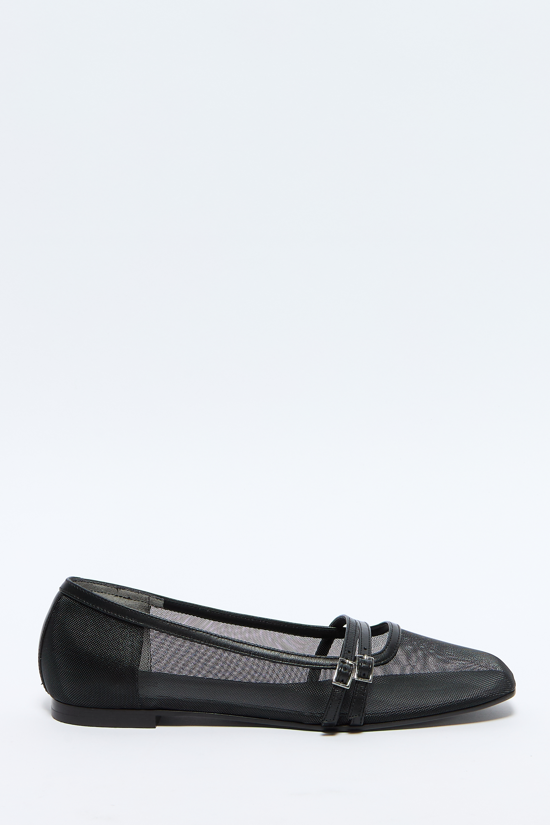 Сетчатый дизайн, квадратный носок, застежка с двумя пряжками, стелька с логотипом, плоская подошва.
