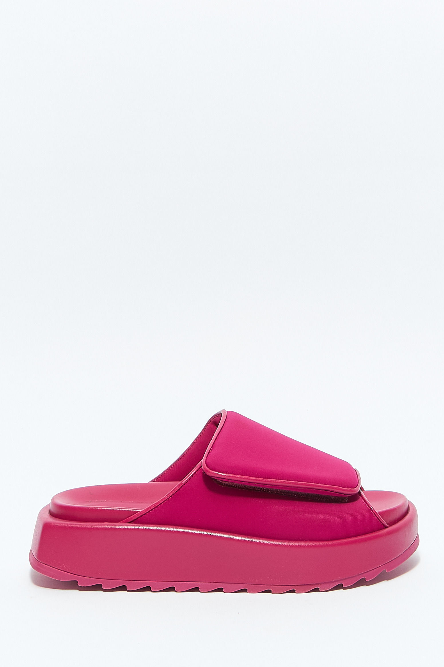 Застежка на липучке сбоку, дутый материал, открытый носок, стелька с логотипом и резиновая подошва.