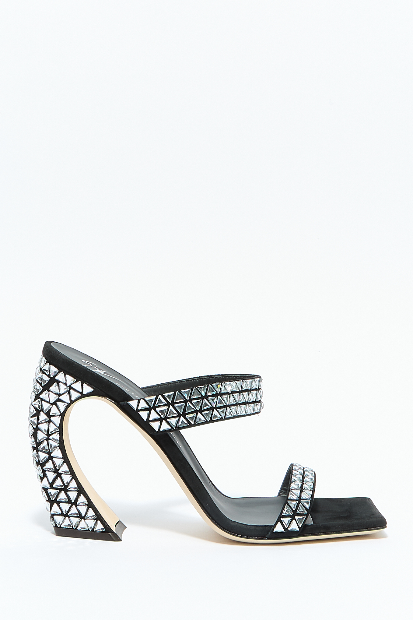 Кожаная стелька с логотипом, открытый квадратный носок, каблук и ремешки украшены кристалами, высота каблука 11 см,