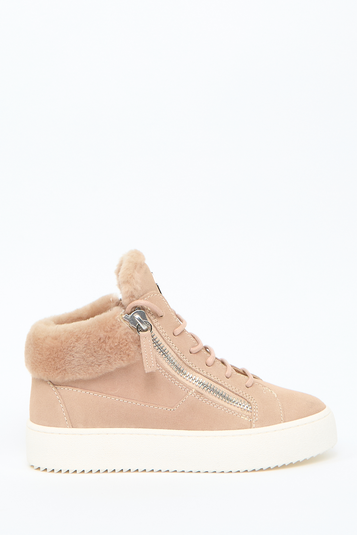 Замша, отделка из овчины, закругленный носок, металлический логотип, шнуровка спереди, отделка с декоративной молнией и плоская резиновая подошва.
