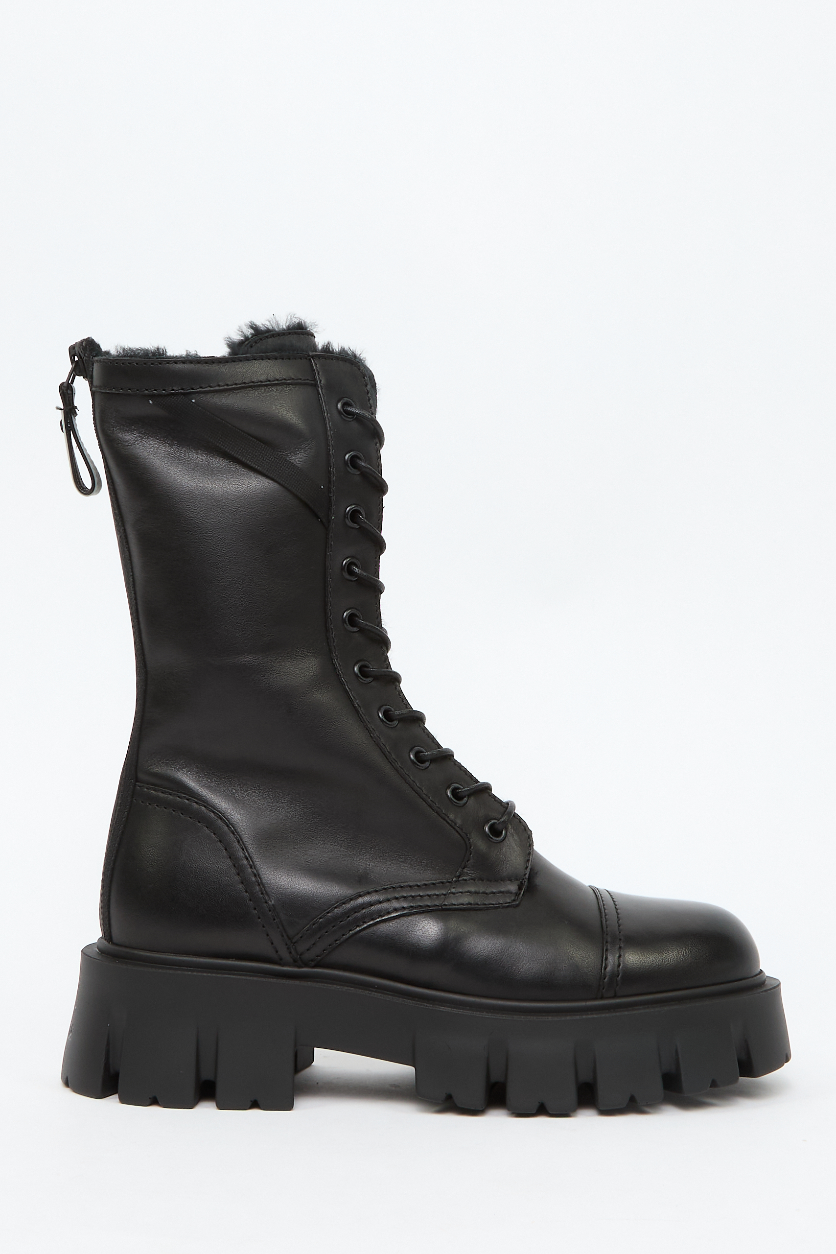 Черный, телячья кожа, длина до середины голени, декоративная шнуровка, закругленный носок, застежка на молнии сзади, низкий каблук и массивная резиновая подошва c протектором.
