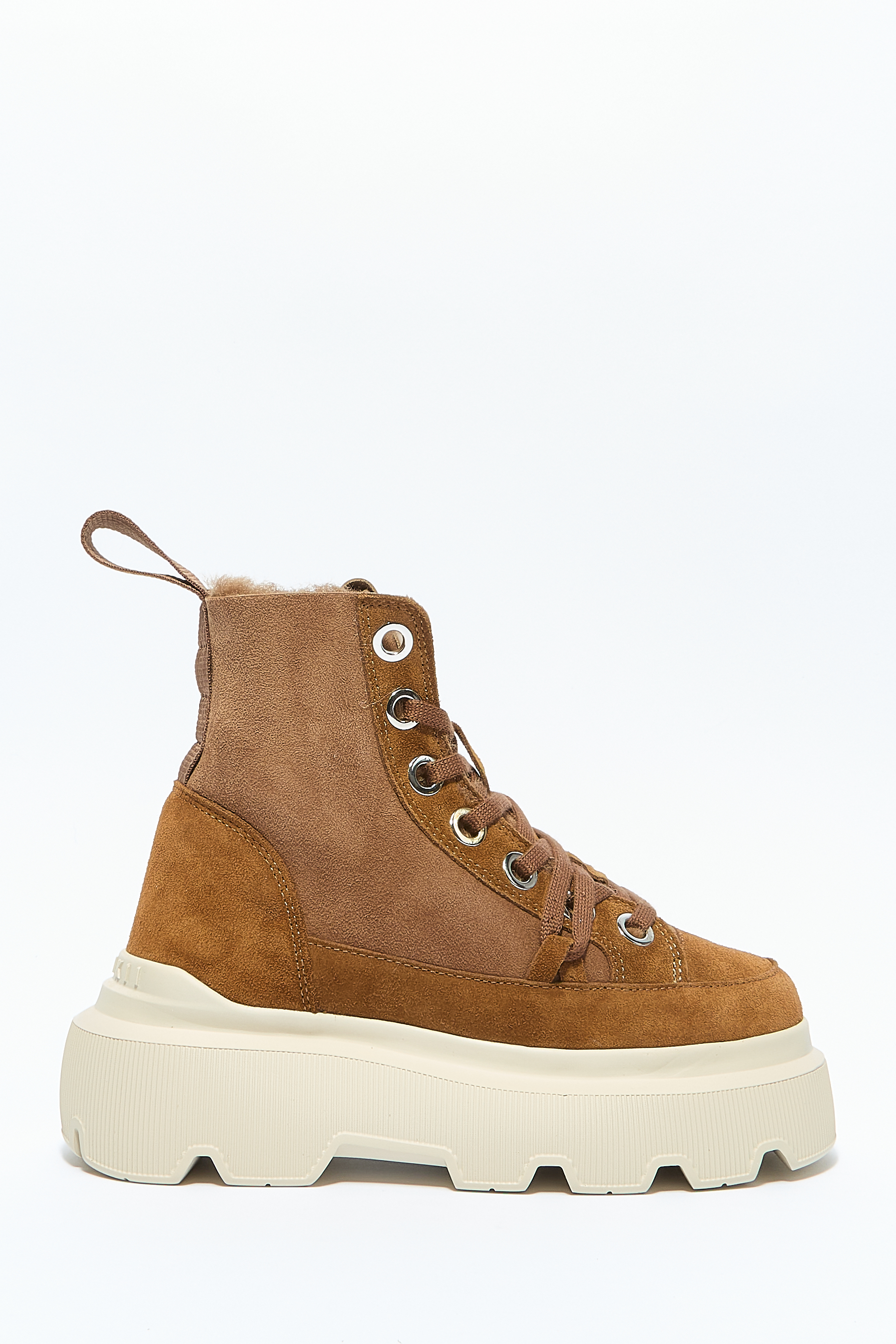 Верх выполнен из комбинации замши и кожи.Модель привлекает внимание своей характерной толстой шнуровкой.Ботинки утеплены натуральной овчиной, которая сохраняет тепло и защищает от холода.Толстая резиновая подошва обеспечивает амортизацию и стабилизацию стопы.