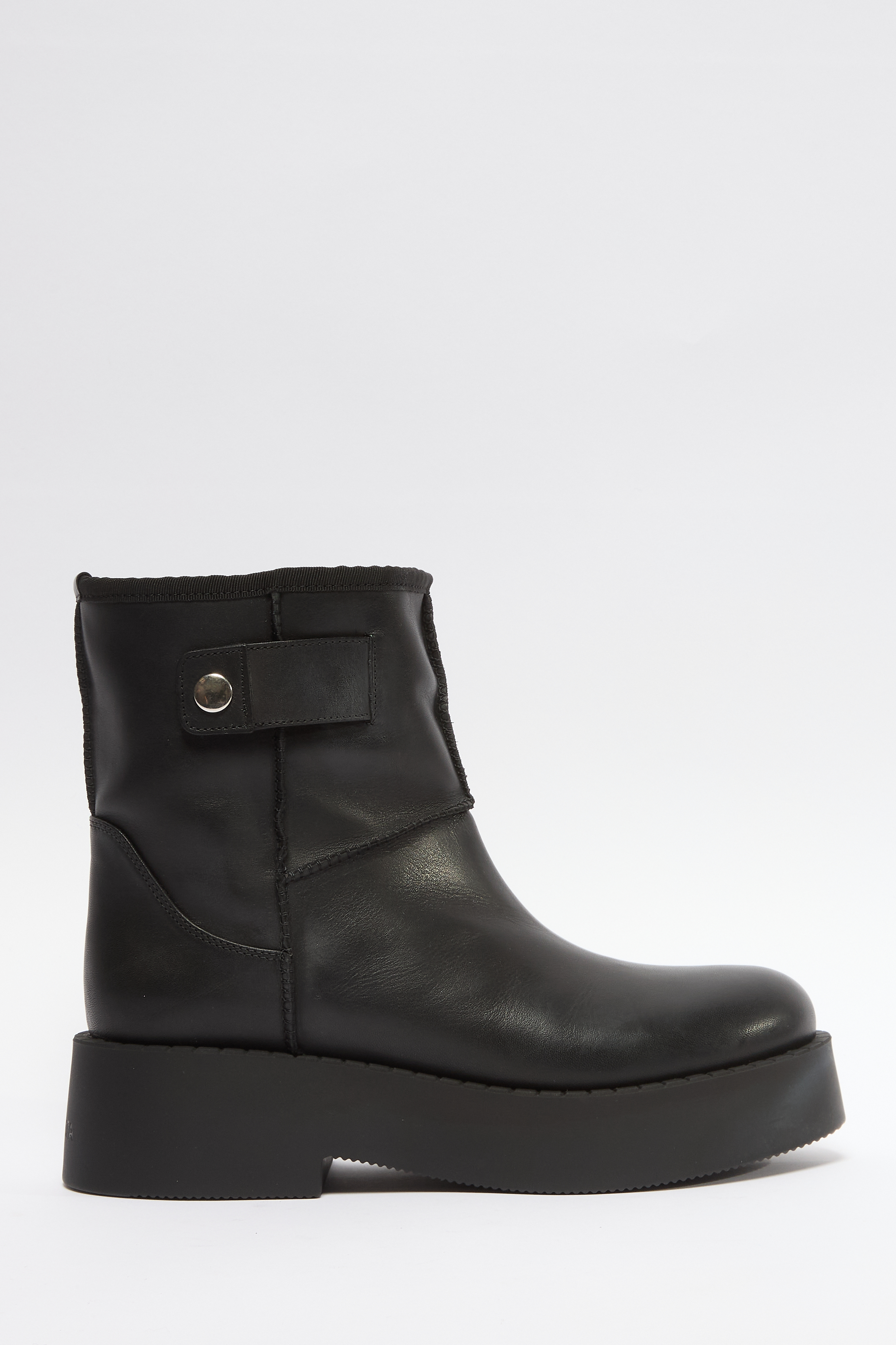 Ботинки с круглым мысом и широкой литой подошвой сшили из гладкой кожи.Модель, отделанную внутри овчиной, дополнили сбоку декоративным ремешком с кнопкой.