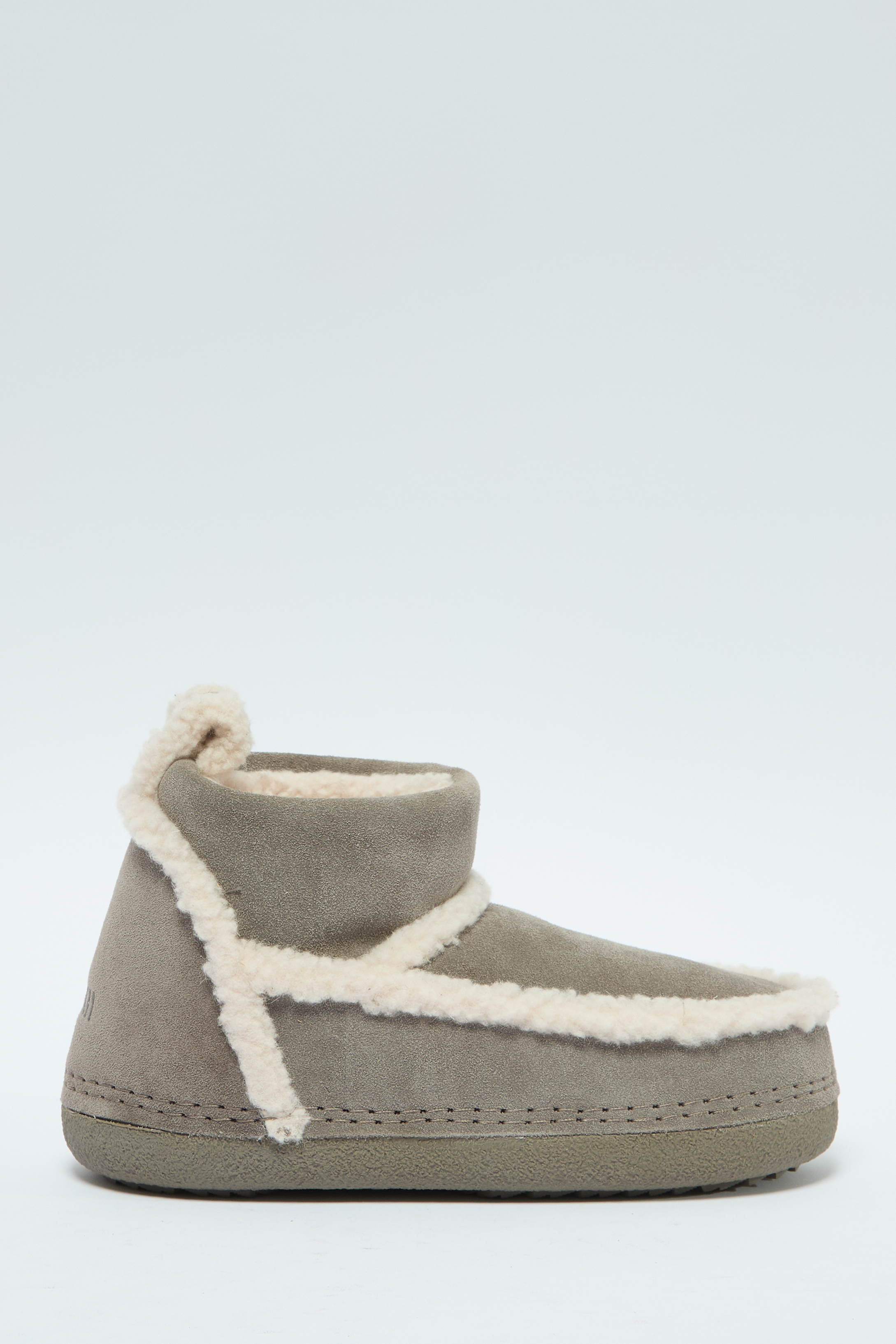 Круглый, слегка уплотненный носок, контрастная обшивка мехом, сзади петля, внутренняя часть - шерсть, утепленная модель, прочная и устойчивая к повреждениям подошва, модель на платформе.