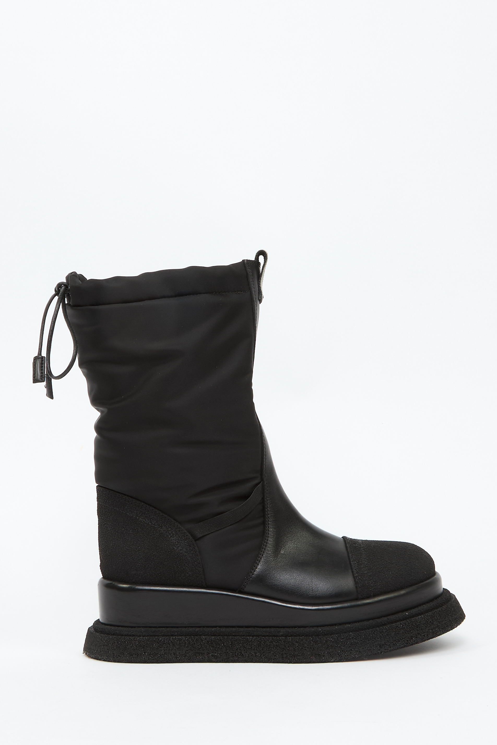 Контрастный носок, массивная резиновая подошва c протектором и застежка на молнии спереди.