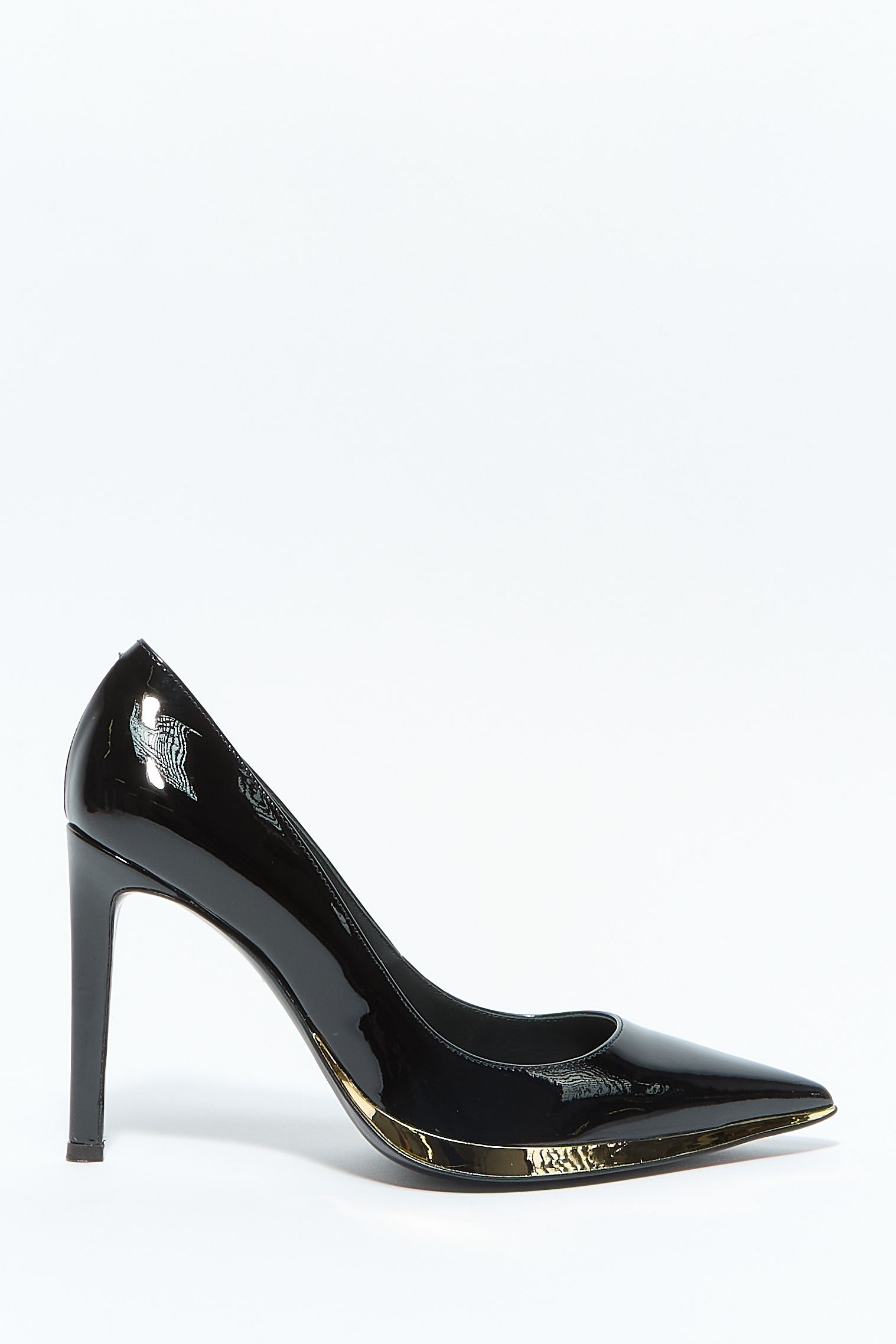 Кожа, золотистое обрамление сбоку, эффект металлик, глянцевый финиш, высокий каблук и заостренный носок.