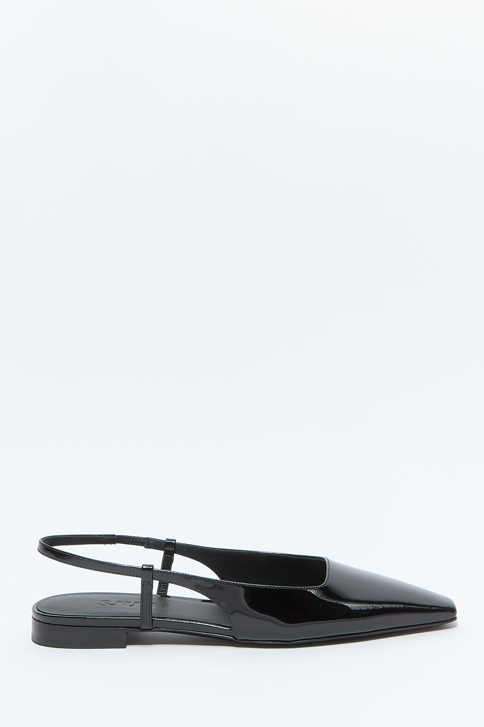 Зернистая текстура, квадратный носок, эластичный ремешок на пятке, логотип на стельке, кожаная подкладка, низкий скульптурный каблук, лаковое покрытие, без застежки.