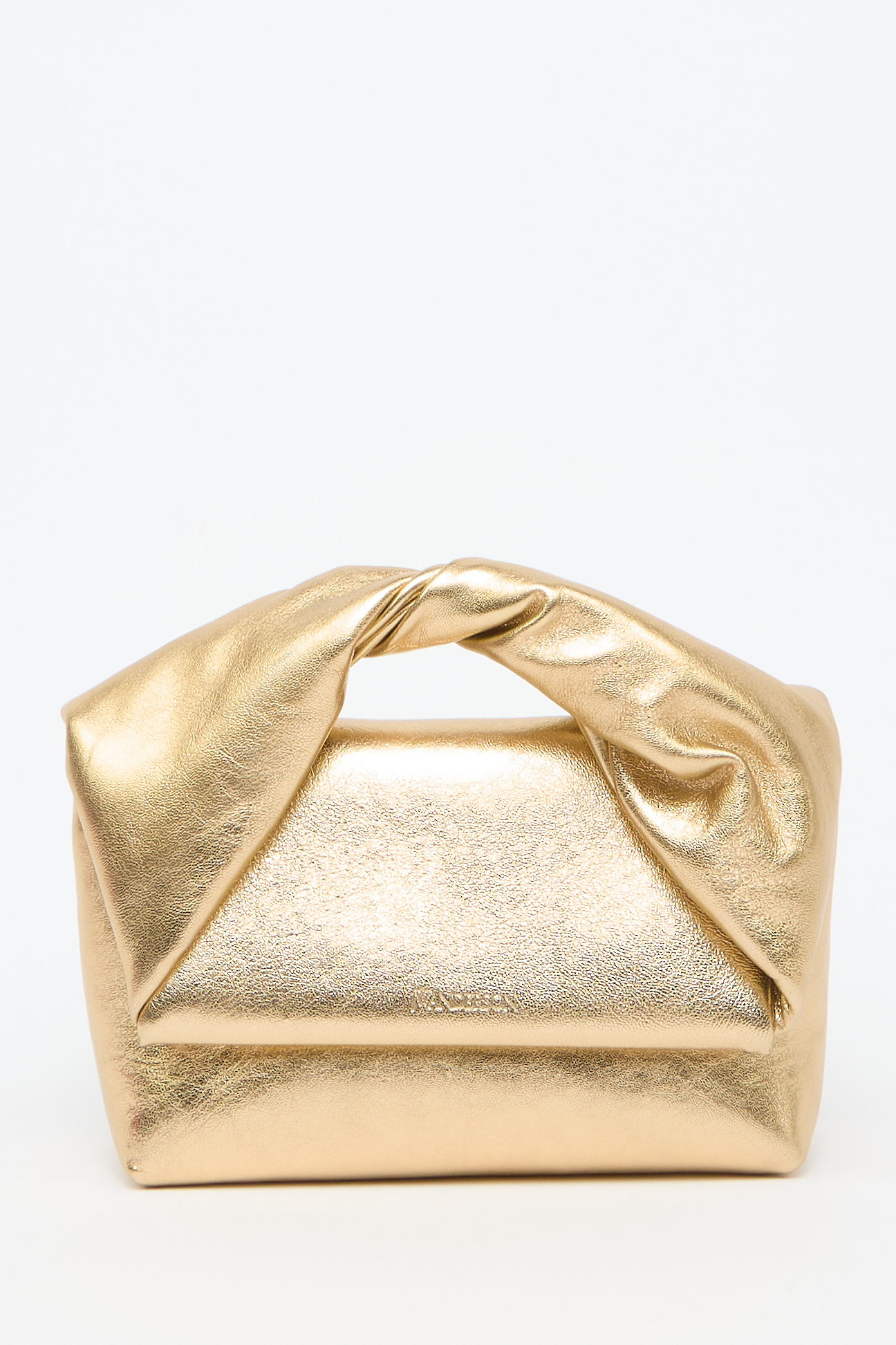 Тисненый логотип спереди, эффект золотистый металлик, перекрученная верхняя ручка, ремешок-цепочка на плечо и откидной клапан на магните.